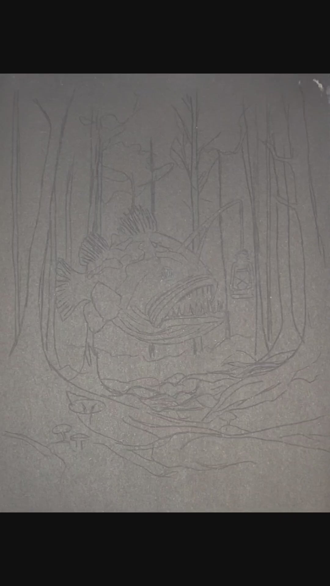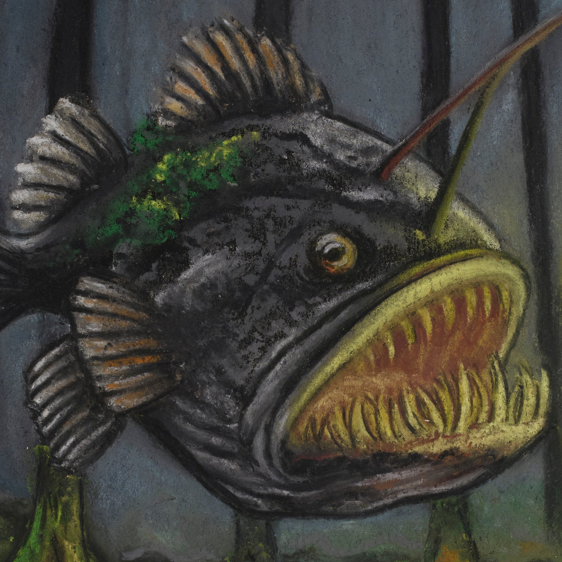 Created in soft pastel on paper, the piece has a soft, layered texture with controlled detail in the fish and surrounding forest. The glow from the lantern becomes the focal point, pulling the eye through the darker tones and adding a sense of direction within the scene.